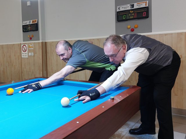 Die beste Leistung des ersten Tages gab es schon in der ersten Aufnahme der ersten Partie zu bewundern: Horst Wiedemann begann mit einer flüssig vorgetragenen Serie von 185 Points und gewann deutlich mit 250:58 in 6 Aufnahmen. Die zweite Partie verlief dann spannender, nach der neunten Aufnahme stand es 233:232 für Horst, der dann mit 17 Points die Partie beendete. Im Nachstoß gelangen Dirk noch 3 Points zum Endstand von 250:235.