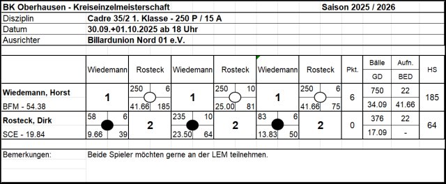 Da die zweite Partie erst nach 22 Uhr beendet war, wurde Partie Nr. 3 am Mittwoch (01.10.) ab 18 Uhr gespielt. Auch diese Partie gewann Horst in 6 Aufnahmen, das Ergebnis war diesmal 250:83. Herzlichen Glückwunsch zum KEM-Sieg und toi-toi für die LEM!