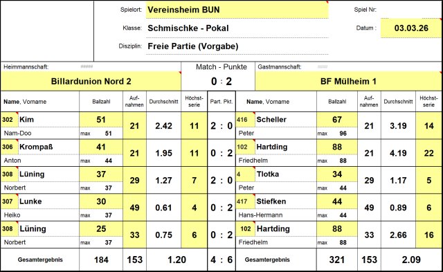 Am Dienstag hatte unser Pokalteam 2 zuhause das Viertelfinalspiel gegen die Mannschaft der BF Mülheim zu absolvieren. In der ersten Spielrunde verlor Heiko Lunke mit 30:37 gegen Hans-Hermann Stiefken, während parallel Norbert Lüning ein 37:30-Sieg gegen Peter Tlotka gelang.