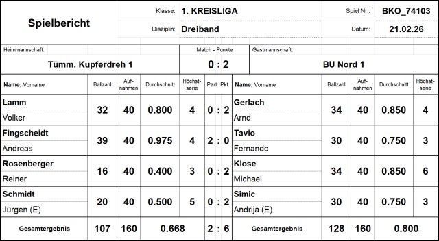 Die beste Partie des Spiels gelang Andreas Fingscheidt mit 39:30 gegen Fernando Tavio. Da parallel aber Arnd Gerlach knapp mit 34:32 gegen Volker Lamm gewinnen konnte, gewann unser Team mit 6:2. Glückwunsch zur geschlossenen Mannschaftsleistung!