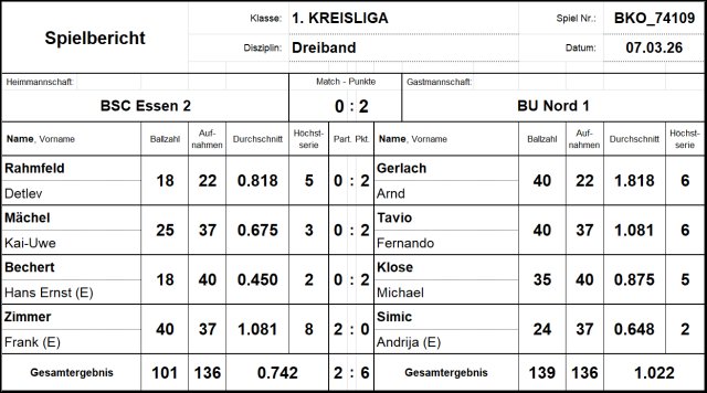 Im „Lokalduell“ musste unsere erste Mannschaft beim BSC Essen antreten. Andrija Simic konnte sich gegenüber dem letzten Spiel zwar deutlich verbessern, war aber gegen den stark aufspielenden Frank Zimmer mit 24:40 in 37 Aufnahmen chancenlos. Da aber Michael Klose gleichzeitig aber mit 35:17 ebenso klar gegen Hans Bechert siegte, stand es nach der ersten Runde 2:2.