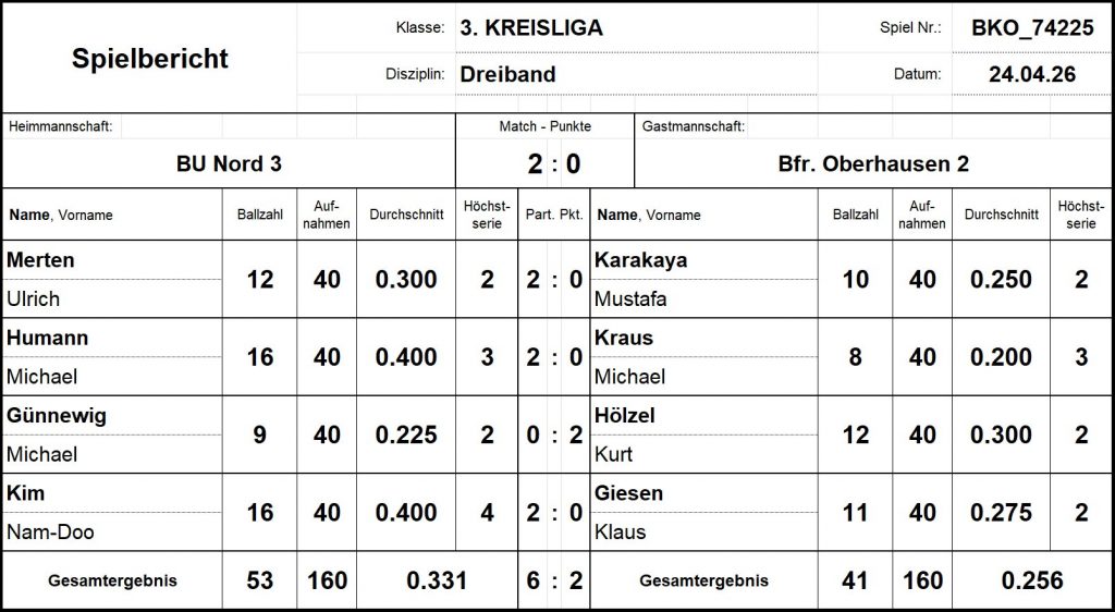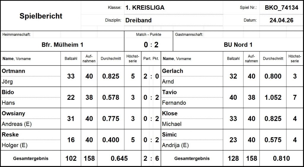 Die erste Mannschaft trat bei den Bfr. Mülheim an. Andrija Simic konnte den stark startenden Holger Reske im Laufe der Partie ein- und überholen und gewann klar mit 23:16. Michael Klose hatte gegen Andreas Owsiany etwas mehr Mühe, setzte sich aber mit 33:31 durch. In der zweiten Spielrunde spielte Fernando Tavio gegen Hans Bido lange sehr stark, brauchte dann aber für die letzten zwei Bälle noch relativ viele Aufnahmen und spielte damit mit 40:22 in 38 Aufnahmen „nur“ knapp über 1 GD. Arnd Gerlach kam nicht so stark wie gewohnt in die Partie und unterlag Jörg Ortmann knapp mit 32:33. Mit dem 6:2-Sieg verteidigt unsere erste Mannschaft weiter die Tabellenführung.
