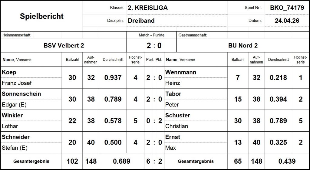 Beim Auswärtsspiel in Velbert kam unsere zweite Mannschaft nicht besonders gut zurecht. Eine Ausnahme war Christian Schuster, der sich durch den starken Start von Lothar Winkler nicht aus dem Konzept bringen ließ. Christian holte nach und nach auf, setzte sich dann klar ab und siegte mit 30:22 in 38 Aufnahmen. Heinz, Max und Peter verloren jeweils klar, so dass das Spiel mit einer 2:6-Niederlage endete.
