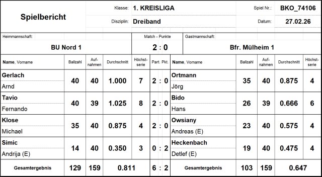 Unsere Erste absolvierte am Freitag ihr Heimspiel gegen die Bfr. Mülheim. Andrija Simic erwischte keinen guten Tag und verlor klar mit 14:19 gegen Detlef Heckenbach. Besser erging es Michael Klose, der gegen Andreas Owsiany klar mit 35:23 gewann.