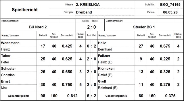 Heinz Wennmann hatte es gegen Bernhard Helle schwer, Bernhard führte zur Halbzeit mit 17:7. In der zweiten Hälfte der Partie erzielten beide Akteure noch 10 Punkte, Bernhard gewann damit 27:17. Peter Tabor und Heinz Falkner starteten beide schwach, nach 19 Aufnahmen führte Peter mit 9:6. Danach spielte Peter stärker, während Heinz nur noch drei Karambolagen gelangen. Damit gewann Peter die Partie klar mit 25:9. Der Mannschaftskampf endete damit mit 6:2 für unser Team, übrigens mit dem sehr guten Mannschafts-GD von 0,612 – Glückwunsch!