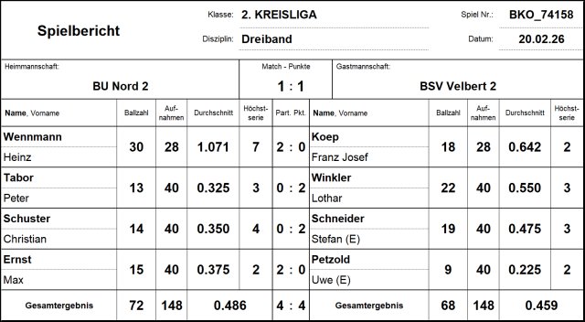 In der zweiten Spielrunde fand Peter Tabor gegen Lothar Winkler nicht zu seinem Spiel und verlor klar mit 13:22. Für das Highlight des Tages sorgte Heinz Wennmann gegen Franz Josef Koep. In den ersten fünfzehn Aufnahmen lagen beide Akteure etwa gleichauf, bevor sich Heinz mit Serien von 5, 7, 5 und 4 klar absetzen und die Partie mit 30:18 in der 28. Aufnahme ausmachen konnte – herzlichen Glückwunsch! Das Unentschieden im Auftaktspiel war insgesamt leistungsgerecht.
