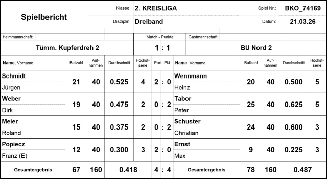 Am gleichen Billard hatte auch Heinz Wennmann gegen Jürgen Schmidt Probleme mit dem Material. Die beiden Akteure lieferten sich eine spannende Partie. In der letzten Aufnahme führte Jürgen mit 21:18, Heinz hatte aber noch den Nachstoß. In diesem konnte er zwei Punkte erzielen. Da aber nach dem zweiten Punkt die Bälle sehr ungüstig lagen, gelang die zum Unentschieden benötigte dritte Karambolage leider aus, Endstand 21:20 für Jürgen. Gut lief es dagegen für Peter Tabor gegen Dirk Weber: Peter konnte die Partie mit 25:19 gewinnen. Insgesamt war das Ergebnis ein Unentschieden gegen den Tabellenführer – Glückwunsch!