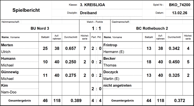 Michael Günnewig und Martin Doczyck spielten an Brett 3 eine umkämpfte Partie, in der Martin knapp mit 13:11 gewinnen konnte. In der zweiten Spielrunde fand Michael Humann gegen Thomas Becker nicht zu seinem Spiel und verlor mit 10:18. Anders sah das an Brett 1 aus, an dem Uli Merten gegen Hermann Frintrop die Partie in der 38. Aufnahme ausmachte – Glückwunsch zum Sieg mit GD 0.657 und einer Höchstserie von 7 Points. Insgesamt endete der Mannschaftskampf somit 4:4.