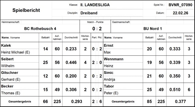 Heinz Wennmann konnte – gesundheitlich etwas angeschlagen – nicht an seine Klassepartie am Freitag (1.071 im Dreiband auf dem kleinen Billard) anknüpfen und verlor mit 19:25 in 56 Aufnahmen gegen Wilhelm Seibert. Da aber Max Ernst die Partie gegen Heinz Michael Kalek mit 20:14 für sich entscheiden konnte, war damit der 6:2-Sieg gesichert. Mit diesem dritten Sieg in Folge festigte das Team seine Position im oberen Mittelfeld. Nun geht es in eine längere Pause, das nächste Spiel findet erst Mitte März statt.