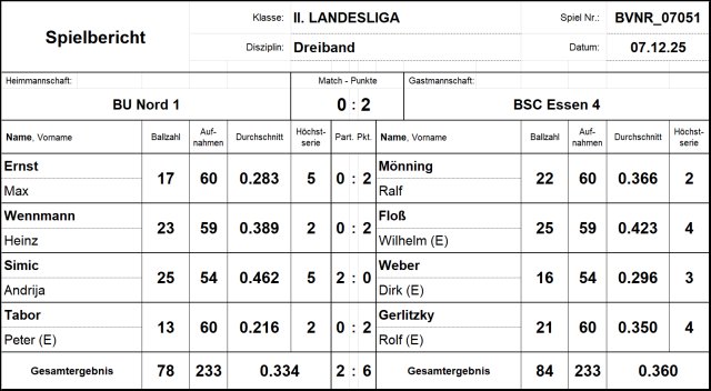 Im letzten DB-Heimspiel der Hinrunde empfing unser Team den Tabellenführer BSC Essen 4. In der ersten Spielrunde gingen beide Partien recht deutlich aus. Andrija Simic startete stark gegen Dirk Weber und machte nach einer kurzen etwas schwächeren Phase die Partie in der 54. Aufnahme aus – 25:16. Parallel verlor Peter Tabor deutlich gegen Rolf Gerlitzky mit 13:21.