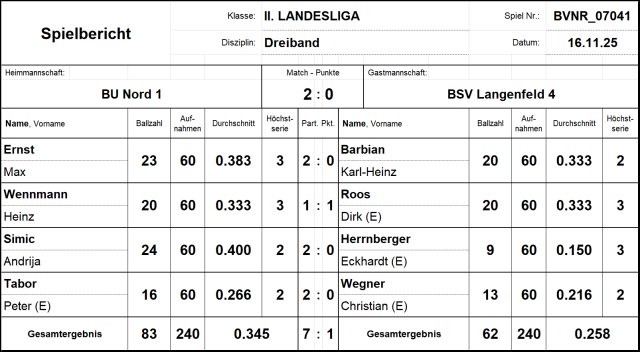 Unser Landesligateam hatte wieder mal ein Heimspiel, diesmal gegen die vierte Mannschaft des BSV Langenfeld. In der ersten Spielrunde hatte Andrija Simic bei seinem 24:9-Sieg gegen Eckhardt Herrnberger wenig Mühe. Ganz anders sah es da in der Partie zwischen Christian Wegner und Peter Tabor. Nach ein paar guten Aufnahmen zu Beginn leistete sich Peter reichlich Fehlaufnahmen und lag nach drei Vierteln der Partie zurück. Das letzte Viertel lief dann besser und Peter konnte mit 16:13 gewinnen.