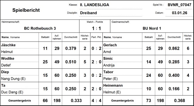 Da Heinz Wennmann über den Jahreswehsel verreist und Max Ernst kurzfristig verhindert war, mussten unser Landesliga-Team mit zwei Ersatzspielern beim BC Rothebusch antreten. So war die Mannschaftsaufstellung zum ersten Mal in der Saison anders als gewohnt. Helmut Heinemann, der kurzfristig für Max spielte (danke, Helmut!), kam in der Anfangsphase seiner ersten Ligapartie auf dem Matchbilland gut gegen Duc Dang Ta zurecht und konnte lange mithalten. Letztendlich setzte sich aber dann der erfahrenere Spieler mit 15:10 durch. Parallel spielte Peter Tabor eine gute Partie gegen Nang Dung Diep und siegte 24:15. Ein kleiner Wermutstropfen war dabei, dass Peter es mit 12 Fehlaufnahmen zum Ende der Partie versäumte, vorzeitig auszumachen.