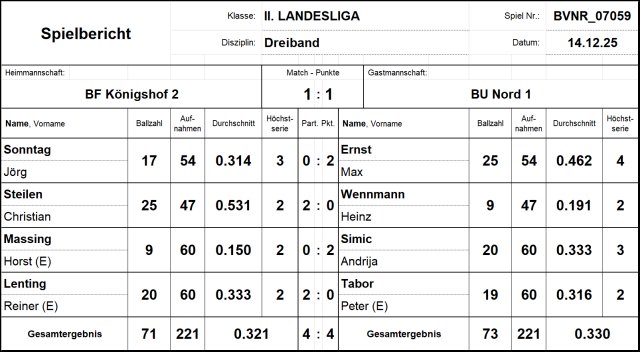 In der zweiten Spielrunde war Heinz Wennmann beim 9:25 gegen einen stark aufspielenden Christian Steilen chancenlos. Max Ernst spielte dagegen konzentriert und gut gegen einen glücklos agierenden Jörg Sonntag und machte in der 54. Aufnahme zum 25:17 aus und sicherte der Mannschaft den Auswärtspunkt.