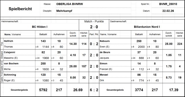 Einen Tag nach dem Erreichen des Vizemeistertitels im Vierkampf stand das schwere Auswärtsspiel beim BC Hilden an. Sven Nabuurs gewann die Freie Partie mit 250:143 gegen Thomas Helfrich in 10 Aufnahmen, u.a. mit einer Höchstserie von 224 Punkten. In der Einbandpartie setzte sich der Lokalmatador Massimo Colajanni mit 82:37 gegen Jacques de Beurs durch – Zwischenstand 2:2.