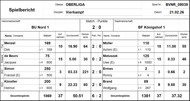 Im letzten Spiel der Vierkampf-Saison musste unser Oberliga-Team gegen Königshof unbedingt punkten, um sich die DMM-Teilnahme zu sichern. In der Freien Partie lieferten sich Dirk Menzel und Achim Müller eine spannende Partie, die Dirk letztendlich mit 169:110 gewann. Parallel verlor Jacques de Beurs gegen Routinier Uwe Matuszak im Einband mit 75:125 – Zwischenstand 2:2.