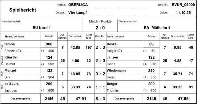 In der zweiten Spielrunde ließ Horst Wiedemann im Cadre 35/2 seinem Gegner Dirk Menzel keine Chance, er gewann sicher mit 250:132 in sieben Aufnahmen. Das spannenste Spiel des Tages lieferten Jacques de Beurs und Thomas Berger. Nach vier Aufnahmen führte Jacques bereits mit 172:75, doch dann brauchte Thomas nur noch zwei Aufnahmen, um mit Serien von 34 und 91 die Partie auszustoßen. Beim Stand von 200:173 hatte Jacques dann Nachstoß. Er machte die noch fehlenden 27 Punkte zum 200:200-Unentschieden, das den 5:3-Sieg für unser Oberliga-Team bedeutete. Damit löste unser Team Mülheim vorerst als Tabellenführer ab. Die Tabelle ist aber wegen unterschiedlicher Anzahl von Spielen noch „schief“, nach dem Doppelspieltag am 22. und 23. November wird das Bild dann wahrscheinlich schon etwas klarer.