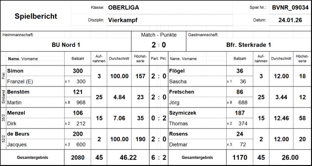 An diesem Wochenende stand für unser Oberliga-Team ein Doppelspieltag an, der am Samstag mit einem Heimspiel in der Vierkampf-Liga gegen Verfolger Bfr. Sterkrade begann. Auf Wunsch der Sterkrader wurden die Cadre-Spiele vorgezogen.