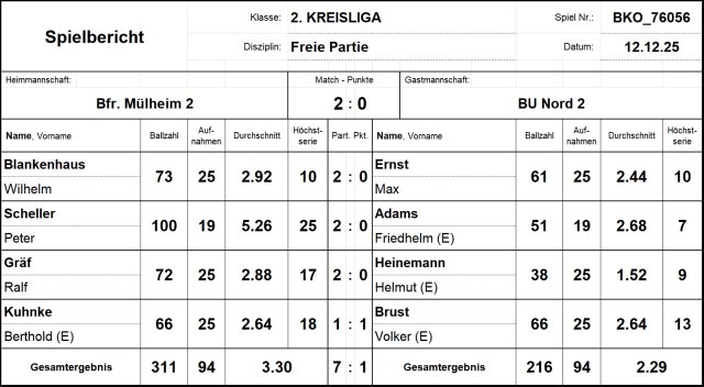 Einen Tag nach unserer dritten Mannschaft (die das Heimrecht getauscht hatte und schon am Donnerstag in Mülheim antrat) spielte auch die Zweite in dieser Spielwoche in Mülheim. In der ersten Spielrunde erreichte Volker Brust ein 66:66-Unentschieden gegen Bethold Kuhnke. Helmut Heinemann agierte glücklos gegen Ralf Gräf und verlor klar mit 38:72. In der zweiten Spielrunde war Friedhelm Adams beim 51:100 in 19 Aufnahmen gegen Peter Scheller chancenlos. Max Ernst verlor mit 61:73 gegen Wilhelm Blankenhaus – Endstand 1:7 – Aua!
