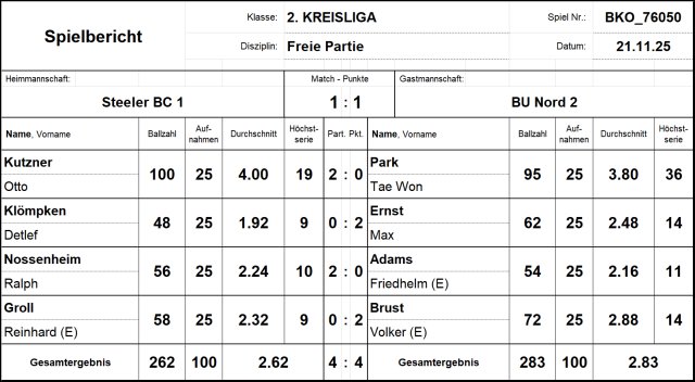 Da aber Tae Won Park gegen Otto Kutzner mit 5 Bällen Rückstand verlor (95:100 in 25 Aufnahmen) und Friedhelm Adams sogar nur mit 2 Bällen Rückstand gegen Ralph Nossenheim (54:56), ging der Mannschaftskampf insgesamt trotzdem „nur“ 4:4 aus – ein etwas ärgerliches Unentschieden.