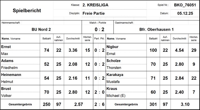 Friedhelm Adams und Thorsten Scholze lieferten sich lange ein Kopf-an-Kopf-Rennen (Zwischenstand 44:44), dann konnte sich Thorsten aber in den letzten fünf Aufnahmen deutlich absetzen. Max Ernst hielt gegen Ernst Nigbur lange mit, konnte aber eine 29er-Serie von Ernst nicht mehr aufholen und verlor mit 74:100 in 22 Aufnahmen. Die Oberhausener gewannen damit 6:2 und verteidigten ihre Tabellenführung – Glückwunsch!