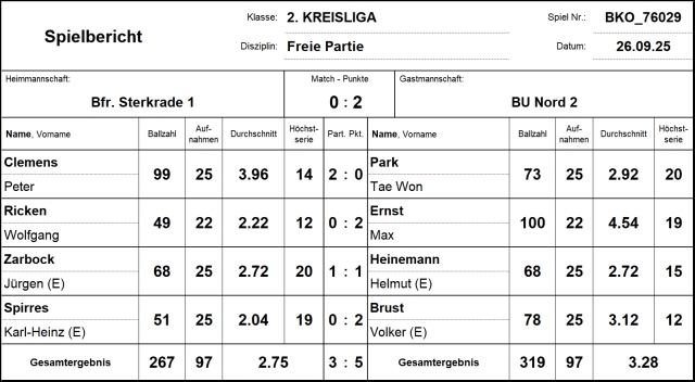 In der zweiten Spielrunde verlor der für den krankheitsbedingt fehlenden Friedhelm Adams spielende Tae Won Park gegen den stark spielenden Peter Clemens mit 73:99. Da aber Volker Brust zum ersten Mal in dieser Saison zu seinem Spiel fand und deutlich mit 78:51 gewann, reichte das zum 5:3-Sieg für unsere Zweite mit einem tollen Mannschafts-GD von 3.28 – herzlichen Glückwunsch und weiter so!