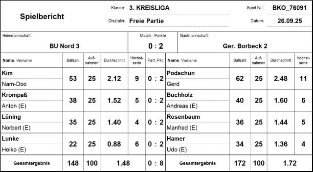 Am 26. September 2025 spielte die 3. Mannschaft Technik der Billardunion Nord ihr Heimspiel gegen Germania Borbeck 2.