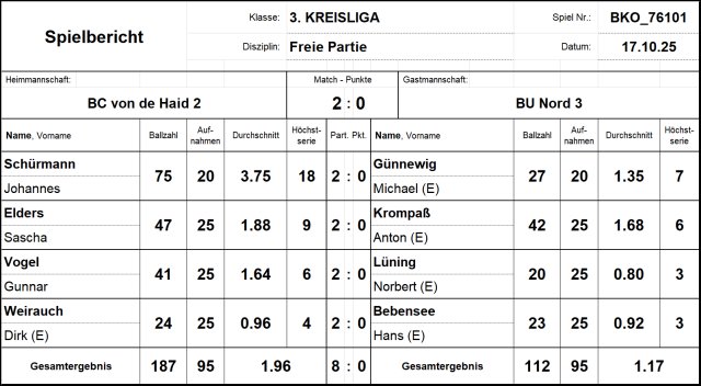 Gegen den BC von de Haid hatte unsere dritte Mannschaft einige Chancen, die sie aber liegen ließ. Hans Bebensee verlor knapp mit einem Ball Unterschied gegen Dirk Weirauch. Auch Anton Krompaß hätte mit etwas mehr Glück gegen Sascha Elders punkten können, verlor aber letztendlich knapp mit 42:47. Chancenlos waren dagegen Norbert Lüning gegen Gunnar Vogel und Michael Günnewig gegen Johannes Schürmann, der mit 75 Bällen in 20 Aufnahmen die beste Partie des Tages spielte.