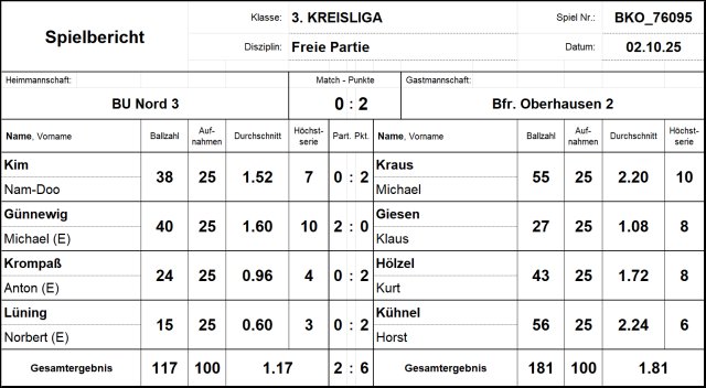 Im Heimspiel gegen die zweite Mannschaft der Bfr. Oberhausen spielte unsere dritte Mannschaft mit Ausnahme des „Kapitäns“ außer Form. Nam-Doo Kim, Toni Krompaß und Norbert Lüning verloren ihre Partien relativ deutlich, lediglich Michael Günnewig konnte seine Partie gewinnen.