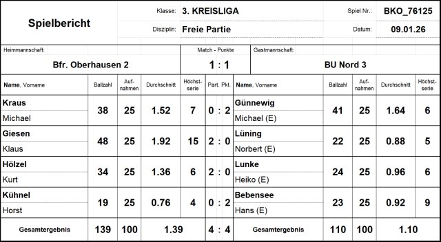 Gegen Klaus Giesen hatte Norbert Lüning klar das Nachsehen und verlor die Partie mit 22:48. Besser erging es Michael Günnewig, der einigermaßen stabil spielte und gegen Michael Kraus zu einem 41:38-Sieg kam.