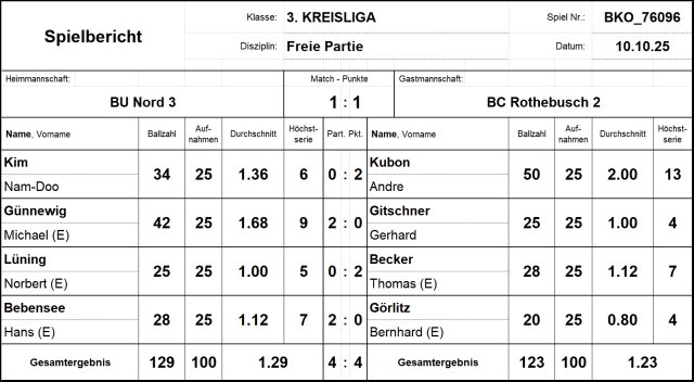 Hans Bebensee war in der ersten Spielrunde gegen Bernhard Görlitz mit 28:25 erfolgreich, während Norbert Lüning gegen Thomas Becker knapp mit 25:28 unterlag. In der zweiten Spielrunde lief es für Nam-Doo Kim gegen Andre Kubon nicht gut, er verlor relativ deutlich mit 34:50. Michael Günnewig konnte sich von Gerhard Gitschner absetzen und dann seinen Vorsprung sicher halten. Durch den 42:25-Sieg sicherte er für unser Team das 4:4-Unentschieden.